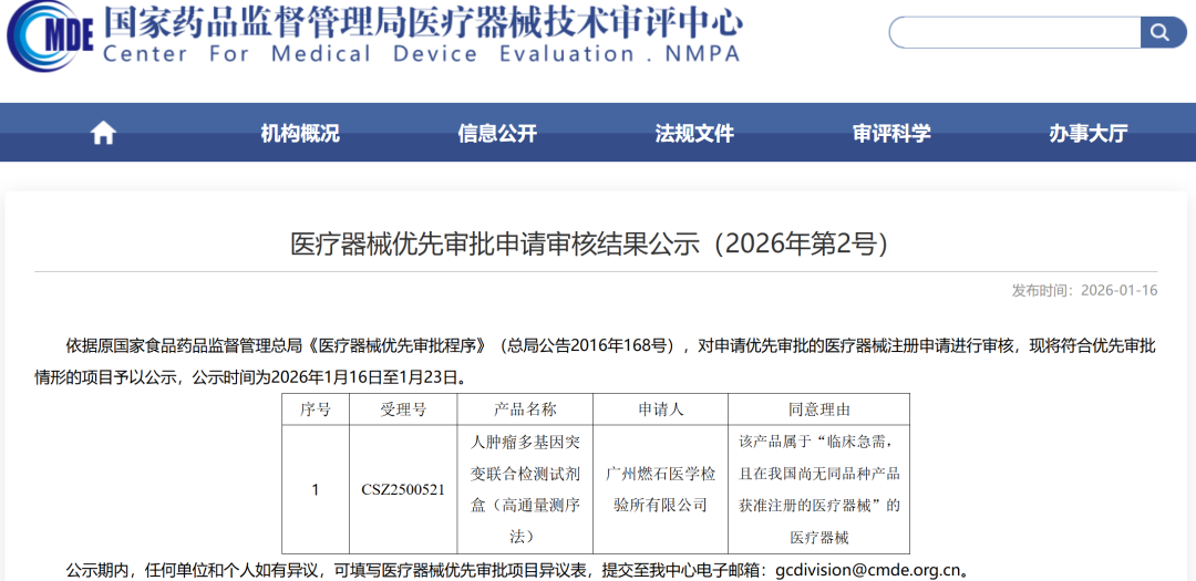 2026年1月16号,依据原国家食品药品监督管理总局《医疗器械优先审批程序》(总局公告2016年168号),广州燃石医学检验所有限公司的“人肿瘤多基因突变联合检测试剂盒(高通量测序法)”进入优先通道公示,其同意理由为:该产品属于“临床急需,且在我国尚无同品种产品获准注册的医疗器械”的医疗器械。恭喜燃石医学。 这是2026年第二款进入优先通道公示的IVD产品,第一款为1月9号鹍远生物的“人DAB2IP、CHFR、GRASP基因甲基化联合检测试剂盒(PCR-荧光探针法)。具体内容如下: 哪些产品可以进行优先注册 根据《体外诊断试剂注册与备案管理办法》第七十二条满足下列情形之一的体外诊断试剂,可以申请适用优先注册程序: (一)诊断罕见病、恶性肿瘤,且具有明显临床优势,诊断老年人特有和多发疾病且目前尚无有效诊断手段,专用于儿童且具有明显临床优势,或者临床急需且在我国尚无同品种产品获准注册的医疗器械; (二)列入国家科技重大专项或者国家重点研发计划的医疗器械; (三)国家药品监督管理局规定的其他可以适用优先注册程序的医疗器械。 |