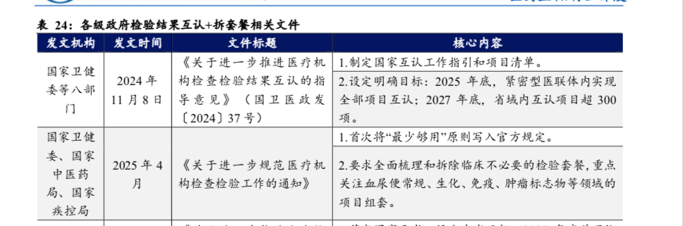 2024年11月8日,国家卫生健康委、国家发展改革委、财政部等七部门联合印发《关于进一步推进医疗机构检查检验结果互认的指导意见》。随后在2025年4月,国家卫健委、中医药管理局、疾控局又联合发布《关于进一步规范医疗机构临床检查检验工作的通知》,首次在官方文件中明确“最少够用”原则,要求全国二级及以上医疗机构在2025年6月底前全面梳理和拆除临床不必要的检验套餐,坚决杜绝重复检查与违规收费。