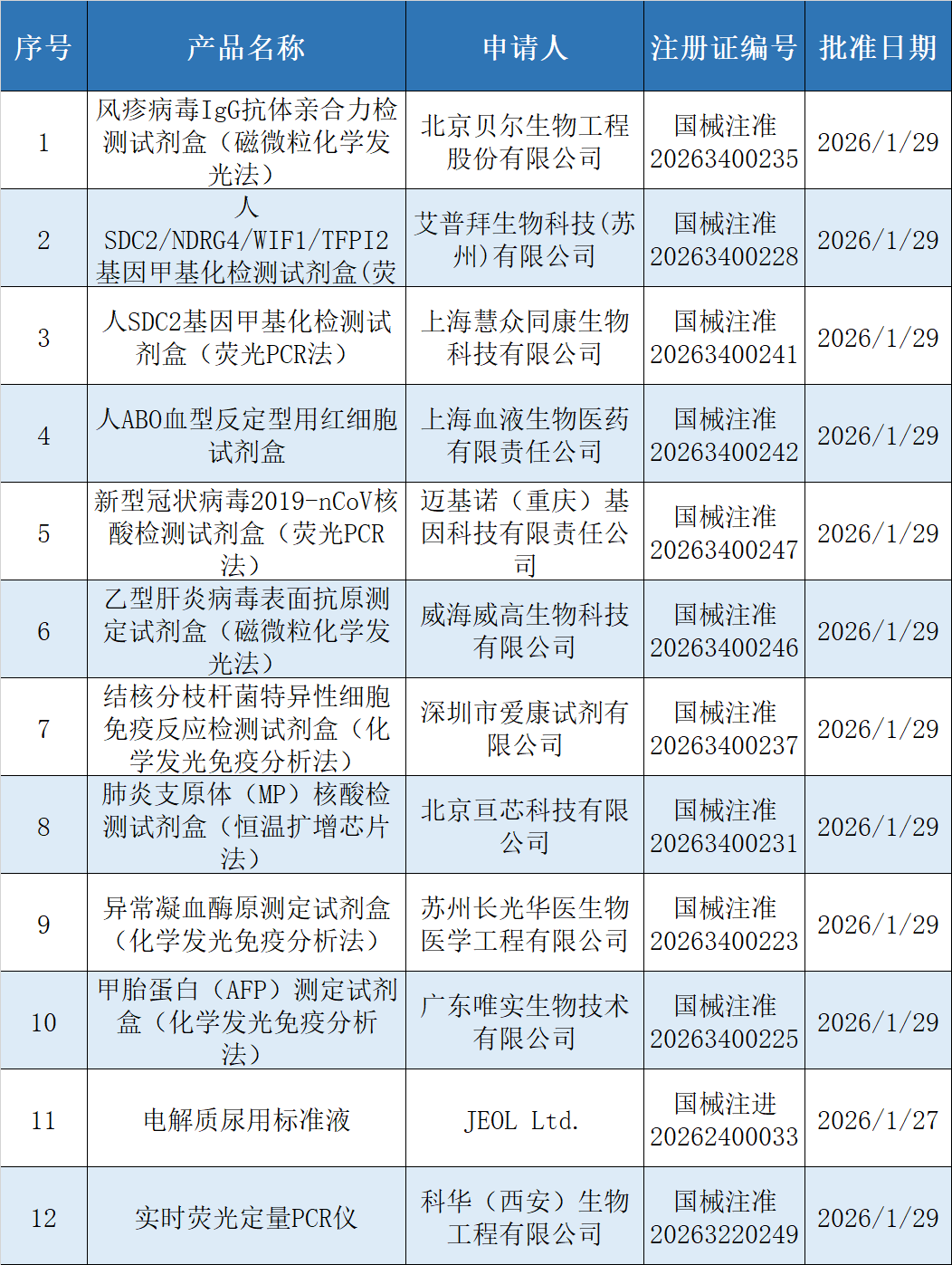 2026年1月29日,国家药监局批准了12款IVD领域新品,新品详细信息如下: