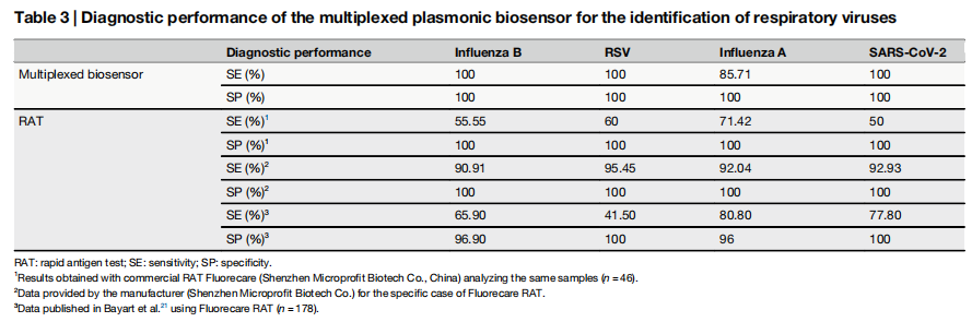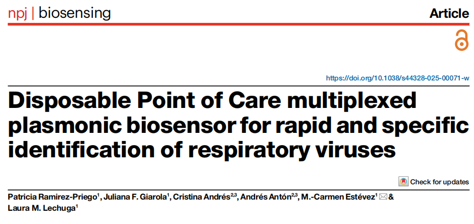 近日,来自西班牙的一组研究团队在杂志npj Biosensing上发表了一篇题为“Disposable Point of Care multiplexed plasmonic biosensor for rapid and specific identification of respiratory viruses”的文章。作者开发了一种基于‌无标记等离子共振技术的多分析物诊断平台,用于快速识别、区分和定量最常见的呼吸道病毒(SARS-CoV-2、流感 A/B 病毒和呼吸道合胞病毒)在鼻咽拭子中的病毒抗原,能够达到纳克/毫升级别的低检测限。临床验证表明,这种新型诊断平台具有高灵敏度(97.22%)和高特异性(100%),与基于 PCR 的分子检测具有极好的相关性。其准确性和用户友好型设计,此传感器可被定位为一种在医疗现场快速进行多重病毒感染诊断的诊断工具。