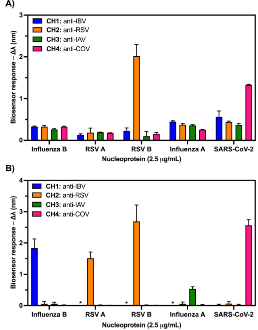 多重检测时,高浓度NP会在非目标通道中出现显著的非特异性结合信号(下图 A),作者通过在运行缓冲液中加入‌硫酸葡聚糖(DS)‌,有效抑制了非特异性相互作用(图 B)。最终得到的检测限(LOD)分别为,乙型流感核蛋白为 31.43 ng/mL、RSV A 核蛋白为 30.63 ng/mL、RSV B 核蛋白为 19.95 ng/mL、甲型流感核蛋白为 118.18 ng/mL、SARS-CoV-2 核蛋白为 10.60 ng/mL。