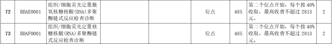 在这里我们也做个小计算,根据此次“废止医疗服务价格项目表(征求意见稿)”中的BDAD0001收费条码我们可以看到:DNA层面,每位点485元,第二个位点开始每个按照40%194元)收取,最高收费不超过2813元;RNA层面计算方式和DNA一致。