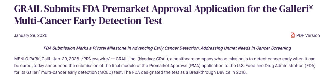 1月29日,Grail宣布其多癌早筛产品Galleri完成了FDA PMA(上市前申请)的提交: