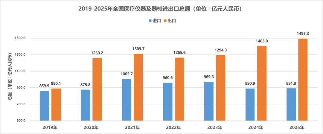1)出口:7年增长68%,国产医疗仪器及器械畅销全球 中国医疗器械出口呈现持续高速增长态势,仅2022年小幅回调。从2019年的 890.1亿元稳步攀升,2024年成功突破1400亿大关,2025年再创新高逼近1500 亿,达到1495.3亿元,7年累计增长约68%。这一亮眼成绩不仅彰显了国内医疗器械产业的国际竞争力持续提升,更印证了全球市场对中国医疗设备的旺盛需求。 2)进口:先增后稳 呈现“先增后稳”的波动特征。2019-2021年从859.9亿元增长至峰值1005.7亿元,2022年后回落并维持在900亿元左右(2022-2025年在890-970亿元区间波动)。这一变化可能与国产高端医疗设备的替代能力提升、国内需求结构调整有关。 二、顺差突破 600 亿(出口-进口),出口主导贸易新生态 |