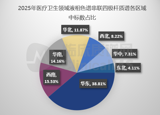 2025年LC-MS/MS采购需求仍集中于华东、西南、华南三大区域,合计占全国采购量的68.49%。其中华东地区以38.81%的占比领跑全国,凭借雄厚的医疗资源、发达的生物医药产业基础,持续成为市场核心腹地。 2025医疗卫生领域LC-MS/MS各区域中标量占比, 临床质谱网制图 区域增长呈现显著分化:华南地区增速超90%,市场潜力全面释放,推测与当地基层医疗扩容、妇幼保健机构设备升级密切相关;而东北地区采购量同比降幅较大,或受区域医疗投入节奏、存量设备更新周期等因素影响。