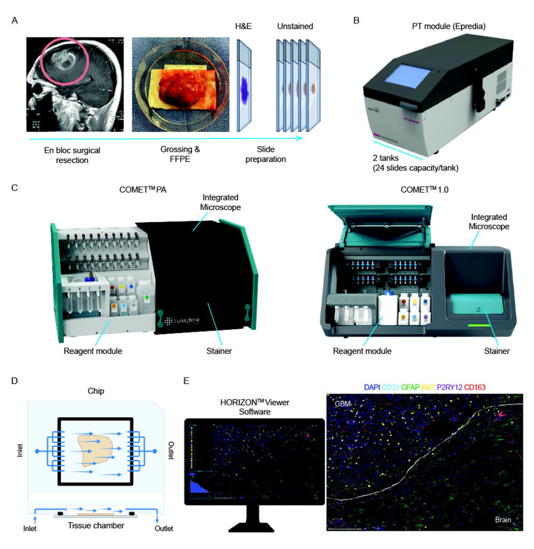 COMET™ 是一款自动化染色/成像设备,它整合了一个用于放置染色缓冲液、市售无标记一抗和荧光标记二抗的试剂台。试剂通过一个可容纳最多4张玻片的圆形玻片板进行加样,玻片随后在显微镜控制的软件下自动成像。通过在 COMET™ 上编目和验证大量抗体,制定中枢神经系统自发荧光管理策略,并优化标准操作程序,我们实现了亚细胞水平的可视化。一个样本最多可使用40种分析物进行分析,这在仅能通过活检对中枢神经系统进行取样的情况下具有临床实用性。 COMET™是一种全自动染色/成像一体化平台,其核心在于 “顺序染色、成像、洗脱”循环: 无需修饰抗体:使用市售未标记一抗与荧光二抗,降低门槛与成本。 微流控芯片:每次循环检测两种蛋白,成像后通过温和洗脱彻底去除抗体,避免信号交叉。 自动化成像与配准:系统自动生成多层OME-TIFF图像,所有通道对齐精准,支持后续深度分析。 支持多种样本:除常规石蜡切片外,也可用于新鲜冰冻样本。