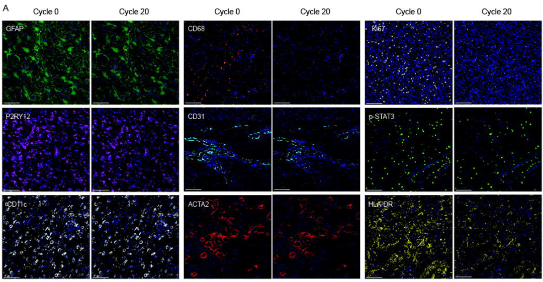 研究团队针对中枢神经系统建立了200余种标志物的验证库,涵盖胶质瘤、阿尔茨海默病、癫痫等多种疾病。其中特别关注了小胶质细胞特异性标志物P2RY12,相比TMEM119,其在人脑组织中更具特异性。 此外,团队还开发了系统的: 抗体优化流程:通过浓度梯度测试确定最佳信号强度 背景荧光校正策略:利用系统自带的荧光淬灭与图像减影功能,有效去除脑组织自发荧光干扰 标志物排列建议:根据抗原稳定性决定其在染色循环中的顺序