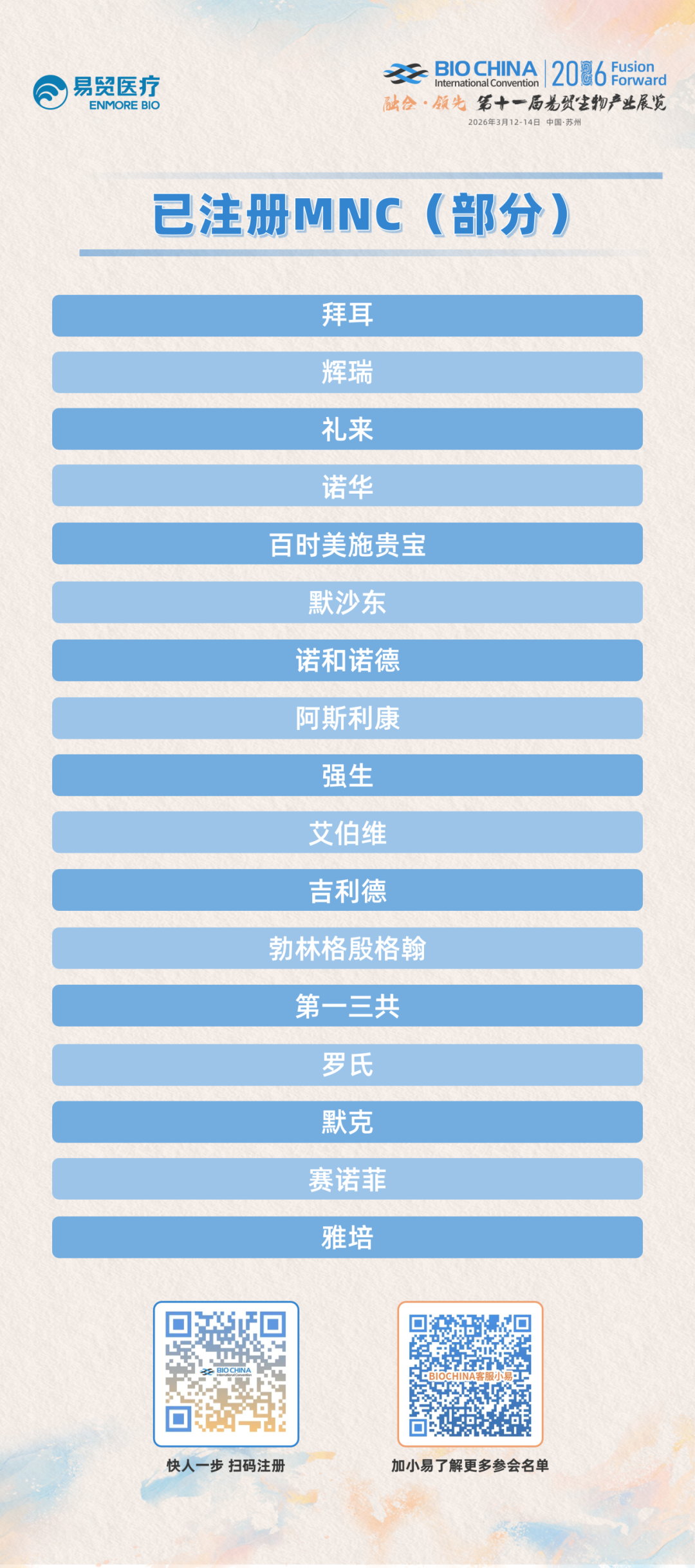 全球生物医药产业迈入创新融合新阶段,BIOCHINA2026 搭建起专业的资源对接场景,成为MNC深耕中国市场、链接全球资源的重要依托。截至目前,拜耳、辉瑞、礼来、诺华、诺和诺德等行业巨头已确认参会,将通过1V1商务约见、主旨论坛、细分论坛、BIONIGHT定向晚宴等多元形式,抢占产业合作先机,共同赋能生物医药产业发展。