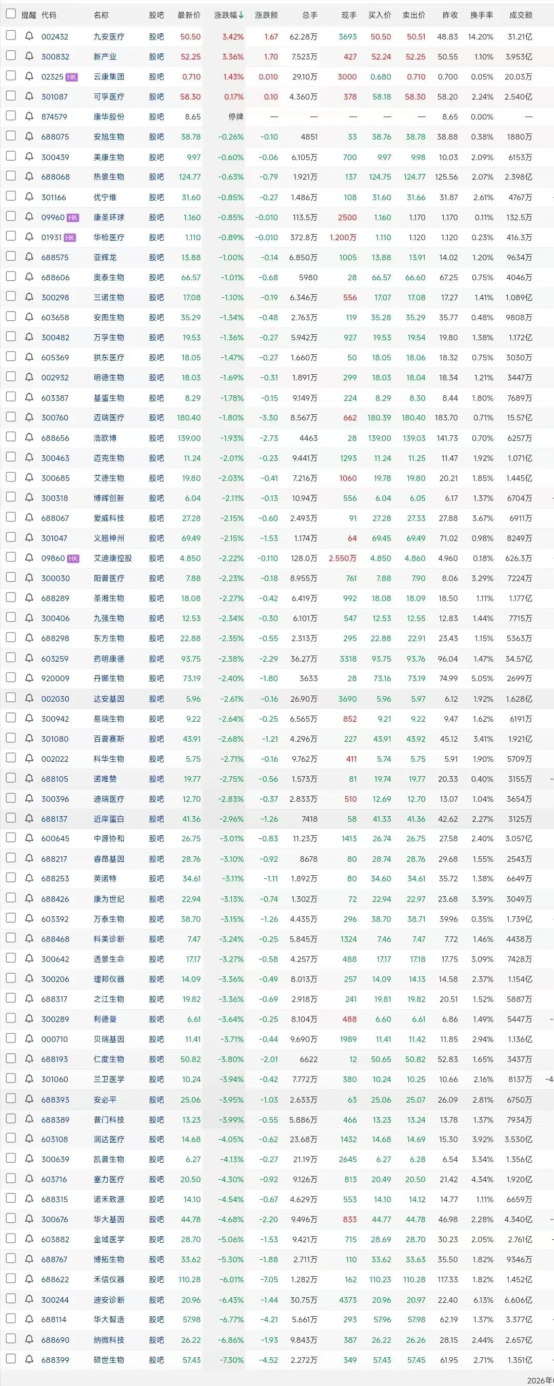 从跌幅榜来看,硕世生物以7.30%的跌幅领跌板块,紧随其后的是纳微科技和华大智造,分别下跌6.86%和6.77%。