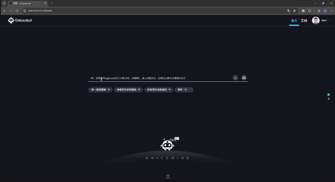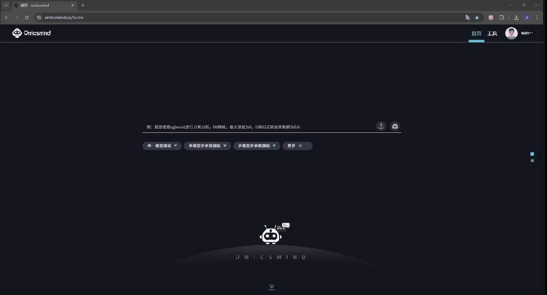 亮点1:智能数据预处理:一键上传,全程自动化质控 无需编写一行代码,只需简单上传你的组学数据(基因组、转录组、蛋白质组等均可),系统将自动识别数据类型、特征维度,智能匹配最优预处理流程,让数据质控不再是 “技术活”: ↔左右滑动查看更多 亮点2:生信专属算法库:覆盖多场景,按需灵活调用 平台集成了 20 + 种深度优化的机器学习算法,每一款都针对组学数据的高维、高噪声、强关联特性进行适配,从初步探索到深度挖掘,再到临床验证,全流程满足你的研究需求。 ↔左右滑动查看更多 亮点3:一体化智能体验:懂生信的 “科研助手”,降低 90% 使用门槛 Omicsmind 不止是工具的堆砌,更是能理解生信科研逻辑的智能系统,让不同基础的科研人都能轻松上手! RAG 知识增强:生信专业问题,秒获精准权威解答 智能对话预处理:自然语言搞定数据质控 智能对话建模:一句话启动模型训练 可视化分析平台:低代码的图形化操控界面 模型评估可视化:一键输出论文级结果 展望未来,Omicsmind除了赋能科研分析,将覆盖从农业育种、医学健康到更多前沿生命科学领域。