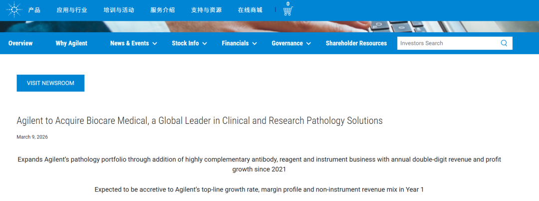 3月9日,生命科学工具巨头安捷伦宣布,将以9.5亿美元全现金收购临床病理学公司Biocare Medical。交易预计在2026财年第四季度完成,Biocare将并入安捷伦的生命科学与诊断市场集团。这是一笔规模并不算巨大的并购——Biocare 2025年收入仅约9000万美元。但放到全球病理诊断产业格局中,这笔交易的意义远不止“补充产品线”。在罗氏、丹纳赫、赛默飞等巨头盘踞的病理市场里,安捷伦正试图重新定义自己的位置。与此同时,它也指向一个更深层的趋势:病理诊断,正在成为生命科学工具巨头的新主战场。在普通投资者眼中,Biocare Medical可能并不知名。但在病理实验室领域,它却是一家典型的“隐形冠军”。Biocare的核心业务集中在组织病理诊断,包括:其中最核心的是抗体产品线。Biocare目前拥有300多种专用抗体,主要用于肿瘤标志物检测。在肿瘤诊断流程中,病理检测仍然是最终确诊的“金标准”,而IHC则是病理检测最重要的技术之一。因此,抗体库越丰富,检测菜单就越多,实验室的诊断能力也越强。- 第一,补强抗体与试剂能力。Biocare的抗体产品线可以直接丰富安捷伦的检测菜单。