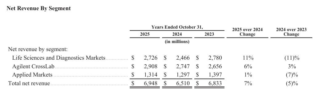 整个组织病理设备市场规模仍在持续增长:2024年约96亿美元,2032年预计达到151亿美元。市场的增长驱动力非常清晰:癌症发病率持续上升,精准医疗推动分子病理发展,自动化和数字病理普及。这也让病理诊断成为IVD行业最稳定的细分赛道之一。但与此同时,这个市场也有一个明显特征:巨头控制设备,小公司提供创新。许多技术创新,往往来自像Biocare这样的中小企业。那一年,安捷伦收购了丹麦病理公司:Dako。Dako是免疫组织化学技术的开创者之一,也是全球重要的病理抗体供应商。目前,病理业务已经成为安捷伦诊断板块的重要组成部分,2024年病理业务年收入已经超过12亿美元。对应罗氏Ventana系统主导的IHC,在2024年诊断收入达25亿美元;丹纳赫 Leica系统在组织处理领域领先,通过自动化工具贡献了18亿美元。安捷伦2025财年(截至2025年10月31日)全年净营收为69.48亿美元,较2024财年增长7%。三大板块之一——生命科学与诊断市场板块的营收在同比增长11%。其中:- 制药市场实现了强劲的营收增长,主要得益于合同研发生产组织、液相色谱及液相色谱质谱联用仪业务的收入贡献。
