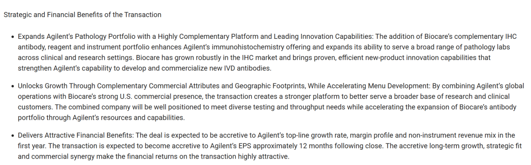 但在这一体系中,抗体和染色质量仍是基础数据源。毕竟AI再先进,也需要高质量染色结果。这意味着:抗体与试剂,仍然是数字病理时代的核心入口。从这个角度看,Biocare并不是简单的产品补充,而是一个重要的技术入口。还有一个细节很值得注意:安捷伦特别强调,这笔收购将提升非仪器收入比例。这其实是IVD的一条重要规律:设备负责装机,耗材负责赚钱。这是一种典型的“剃刀+刀片”模式。在病理领域同样如此。一旦医院装机某一品牌的染色系统,后续试剂、抗体通常会持续使用同一供应商。Biocare的抗体与试剂业务,正好可以强化安捷伦的这一模式。但这次Biocare收购释放出一个信号:安捷伦正在重新启动外延扩张。在生命科学工具行业,巨头们几乎都依赖并购成长:丹纳赫通过并购构建帝国,赛默飞持续整合产业链,罗氏不断强化诊断业务。在精准医疗时代,病理诊断正在成为IVD巨头的必争之地。而安捷伦,显然希望在这场竞争中,重新回到牌桌中央。