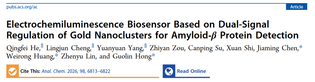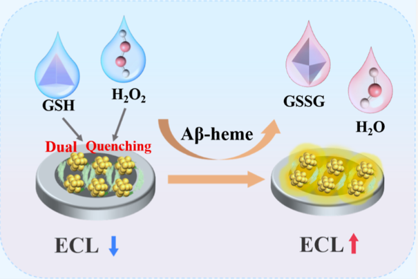 研究创新性地提出“双重猝灭—催化恢复”机制。利用Aβ40与血红素形成的复合物具有过氧化物酶样活性,可催化GSH与H₂O₂发生氧化还原反应,使两者相互消耗,从而解除对AuNCs-ECL信号的猝灭作用,实现信号“关-开”切换。 双重猝灭系统(GSH竞争消耗硫酸根自由基,H₂O₂调控AuNCs价态)相比单一猝灭显著提升了信号抑制效率;而目标物触发的猝灭剂自消耗反应则实现了信号的高倍恢复。 传感器在0.001–100 ng/mL范围内呈良好线性,检出限低至0.18 pg/mL,且具有高特异性与稳定性,成功用于临床血浆样本中Aβ40的检测,与ELISA方法结果一致。 研究通过简化电极修饰步骤(采用液相猝灭剂)、增强信号响应与稳定性,为AD早期无创血液筛查提供了新途径。 该研究提出的GSH/H₂O₂双重猝灭机制,本质上是利用两种小分子在催化作用下的“相互销毁”来实现信号恢复。研究将猝灭剂置于溶液相,通过磁性分离与液相催化反应实现信号调控,减少了电极修饰步骤,提高了系统的可重复性与稳定性,代表了ECL传感设计的一种“去界面化”趋势。尽管Aβ40在血液中浓度极低,但该传感器通过双重调控放大了微弱信号变化,检出限达到fg/mL级别,已接近超早期诊断需求。 研究通过巧妙的双重信号调控设计与纳米簇价态工程,实现了对低浓度Aβ蛋白的高性能检测,不仅为AD早期诊断提供了新工具,也为ECL生物传感的发展提供了重要的思路拓展。 https://pubs.acs.org/doi/10.1021/acs.analchem.5c07069 |
