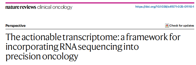 近日,一组来自得克萨斯大学MD安德森癌症中心的研究团队在顶刊nature reviews clinical oncology上发表了一篇题为“The actionable transcriptome: a framework for incorporating RNA sequencing into precision oncology”的perspective文章。作者提出了一个评估 RNA 测序结果在治疗、诊断和预后方面的可行性的框架,其最终目标是将这些复杂的数据有效地纳入癌症患者的个性化治疗中。作者还根据 RNA 表达的治疗可行性定义了一个“可操作转录组”,以帮助指导 RNA 测序结果在临床实践中的应用。作者强调了,全面的RNA分析能够发现DNA测序无法检测到的、具有临床指导意义的分子改变,从而为癌症患者识别更多个性化的治疗机会。