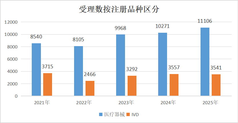受理注册品种分为医疗器械和IVD(体外诊断试剂)两类,其中医疗器械在总数量中的占比从2021年的69%增至2025年的75%,成为注册申报的核心品类。