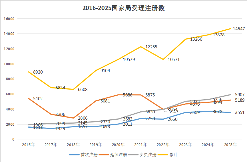 2016-2025年受理注册数量整体呈波动增长态势,首次注册、延续注册、变更注册均保持一定规模,成为进口注册的核心品类。