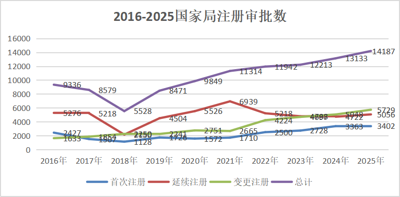 2016年的9336项增长至2025年的14187项,注册批准效率稳步提升,与审评审批制度改革、数字化管理推进密切相关,实现“量增效提”。