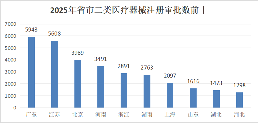 从二类医疗器械区域注册来看,2021-2025年境内二类医疗器械注册审批数呈增长态势,广东、上海、江苏、北京、山东等省份位列前十,成为二类医疗器械市场的核心供给区域。