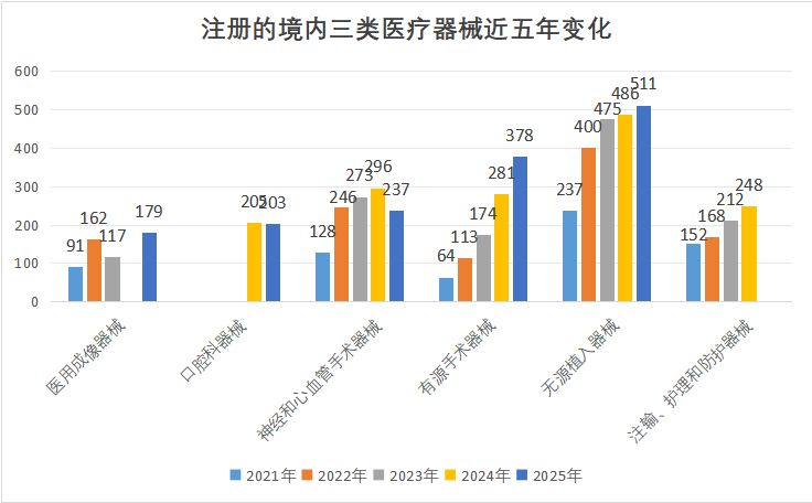 境内三类医疗器械注册品类结构持续优化,医用成像器械、口腔科器械注册数量呈上升态势;神经和心血管手术器械、有源手术器械略有波动;无源植入器械增长显著;注输、护理和防护器械后期增长较大,品类发展与市场需求、技术进步、政策支持高度契合。
