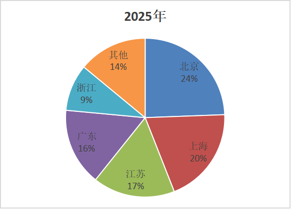 北京、上海、广东、江苏、浙江是境内创新医疗器械获批产品数量和企业数量最多的地区,2020-2025年这五个地区合计占比始终保持在70%以上,成为我国医疗器械创新的核心策源地。