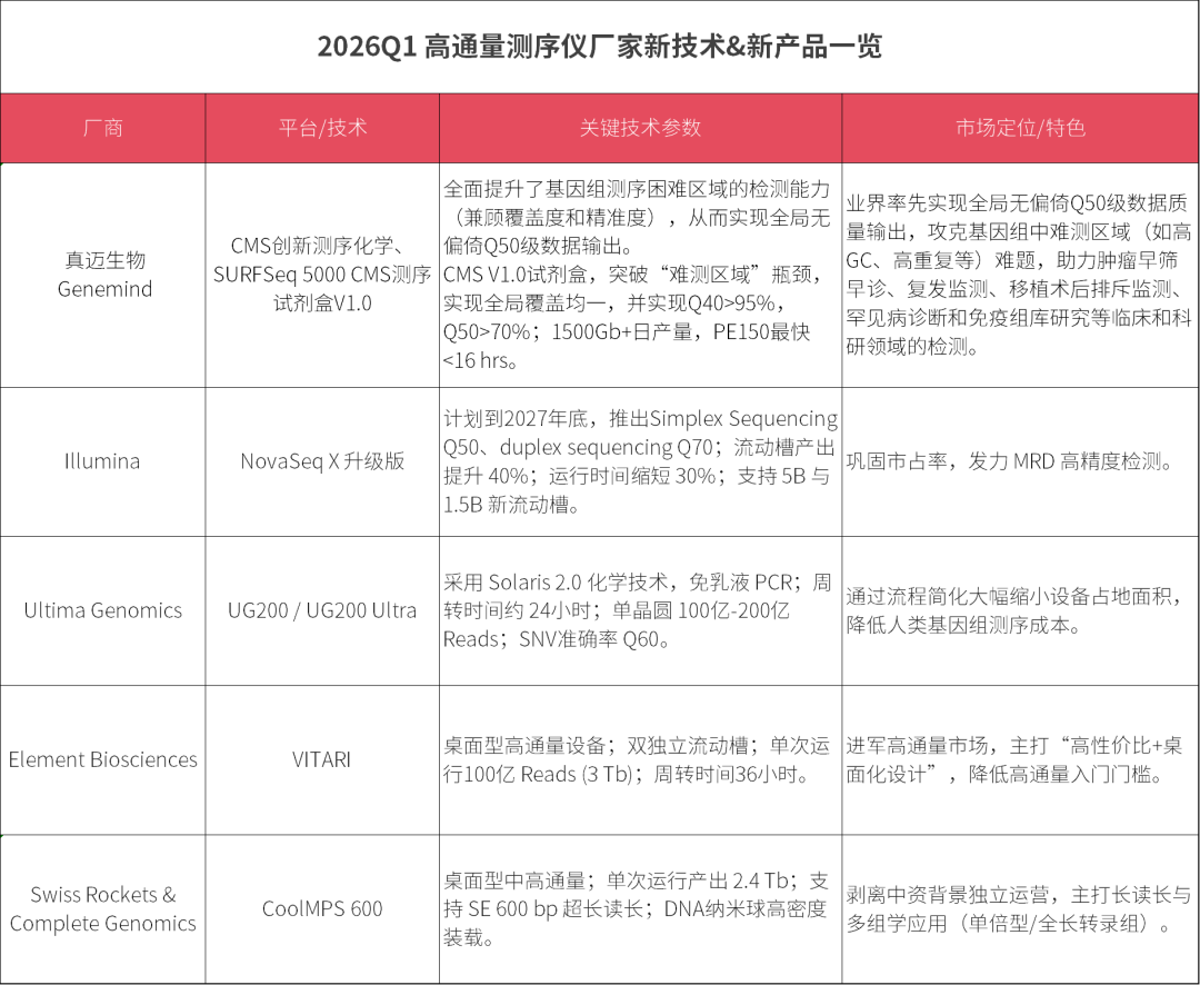 近期,全球基因测序市场迎来多款高通量测序产品的发布与技术路线图更新。01真迈生物(Genemind):推出全局无偏倚Q50创新测序化学CMS技术、CMS试剂盒产品CMS (Cross Mountains and Seas) 是真迈生物推出的创新测序化学技术。该技术依托新型聚合酶突变等创新技术,显著提升基因组难测区域测序能力,优化全基因组测序覆盖均一性,实现全局无偏倚Q50级(99.999%)精度数据输出。 SURFSeq 5000 CMS测序试剂盒V1.0系列产品,集CMS和Lightning Chemistry Plus两大技术于一体,实现极致覆盖:突破“难测区域”瓶颈,全局覆盖均一;极致准确:Q40>95%,Q50>70%;极致效率:1500Gb+日产量,PE150最快<16hrs。CMS技术对于超低频突变、片段丰度定量检测及基因组困难区域覆盖能力突出,可重点赋能肿瘤早筛早诊、复发监测、移植术后排斥监测、罕见病诊断和免疫组库研究等临床和科研领域。