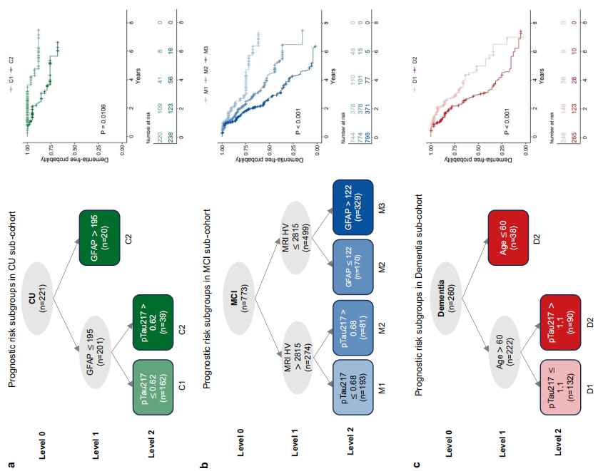 在MCI阶段,海马体积(HV)和 pTau217成为最重要的预后指标,反映了此阶段神经退行性萎缩成为主导进程(如下图b)。海马体积较大且pTau217较低者(M1)风险最低;海马体积较大但pTau217较高者,或海马体积较小但GFAP较低者(M2)为中等风险;海马体积较小且GFAP升高者(M3)为风险最高。