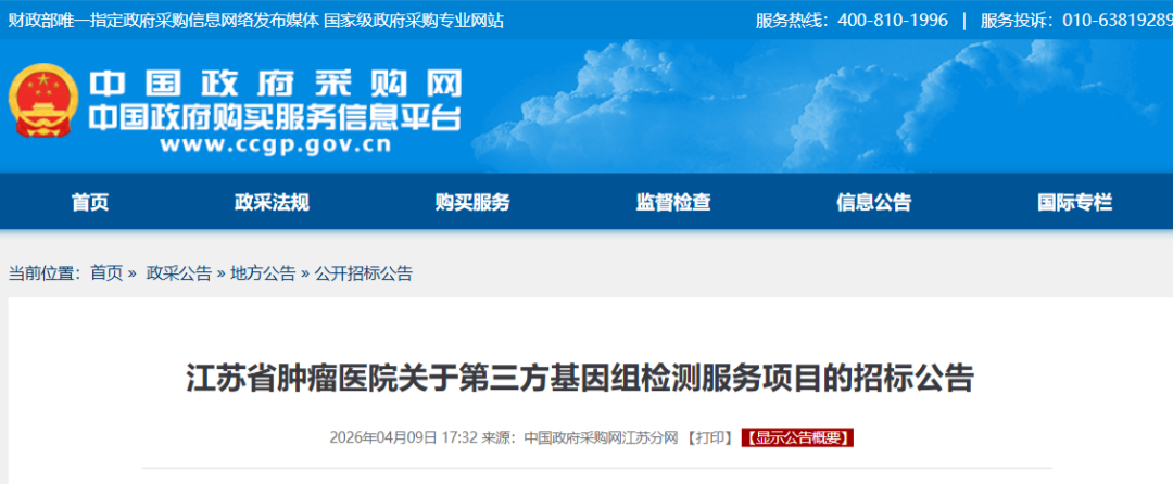 江苏省肿瘤医院第三方基因组检测服务项目(JSZC-320000-HWZX-G2026-0172)招标公告(原文件核心内容):一、公告基础信息发布平台:中国政府采购网(财政部唯一指定政府采购信息网络发布媒体)项目编号:JSZC-320000-HWZX-G2026-0172二、项目核心要求1. 招标文件获取获取方式:潜在投标人需在苏采云系统完成注册登记,成功后在系统内免费下载招标文件获取时间:2026年04月10日至2026年04月29日(每日09:00-17:00,法定节假日除外)2. 投标截止与开标投标文件递交截止时间:2026年04月30日 09:00三、项目背景与补充说明1. 与2024年项目的关联本次为江苏省肿瘤医院2026年新一轮第三方基因组检测服务招标,是2024年1160万元项目(JSZC-320000-HWZX-G2024-0811)的续标/扩容项目。2024年项目总预算1160万元,分6包采购,中标方包括世和基因、燃石医学、思路迪、迈景基因、先声诊断等头部NGS企业本次2026年项目为最新招标,预算金额、分包细则、技术要求以完整招标文件为准,公开渠道已确认该项目为3480万元级年度服务采购2. 采购需求核心方向服务范围覆盖肿瘤临床诊疗全流程的基因组检测,核心品类包括:肿瘤高通量测序(NGS):小panel(<20基因)、中panel(20-200基因)、大panel(200-500基因)、全外显子/全景测序(>500基因)。血液肿瘤基因检测、病原微生物宏基因组测序(mNGS)。遗传性肿瘤易感基因检测、液体活检(ctDNA)动态监测等。配套生信分析、报告解读、临床咨询、质控溯源等全流程服务。3. 合规要求投标单位需具备医疗机构执业许可证(第三方医学检验所)、NGS检测相关资质、临床检验室间质评合格证明。符合江苏省肿瘤基因检测服务集采相关限价要求(江苏为全国首个肿瘤基因检测服务集采省份,2025年落地执行)。四、官方原文件链接中国政府采购网公告入口:江苏省肿瘤医院关于第三方基因组检测服务项目的招标公告江苏政府采购网公告入口:江苏省肿瘤医院第三方基因组检测服务项目招标公告