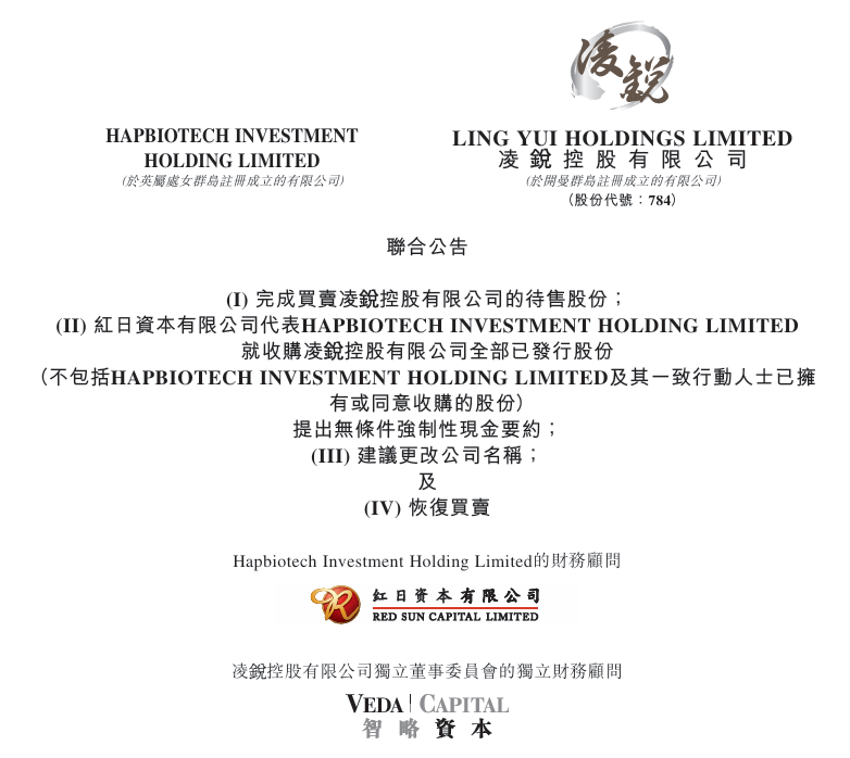 收购完成后,新控股股东海普洛斯已向所有凌锐股东提出无条件强制性现金全面要约,作价同样为每股0.2375港元。