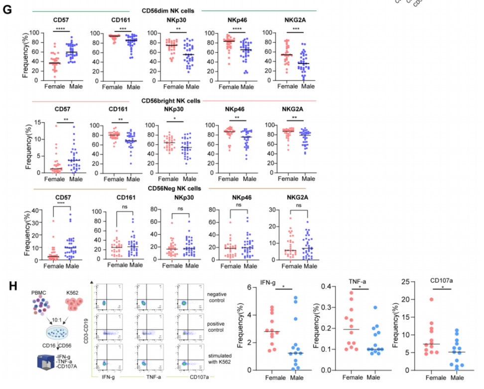 • 杀伤效能: 尽管男性NK细胞看似更多,但在与K562靶细胞共培养时,女性NK细胞脱颗粒(CD107a)和分泌IFN-γ、TNF-α的水平均显著高于男性。