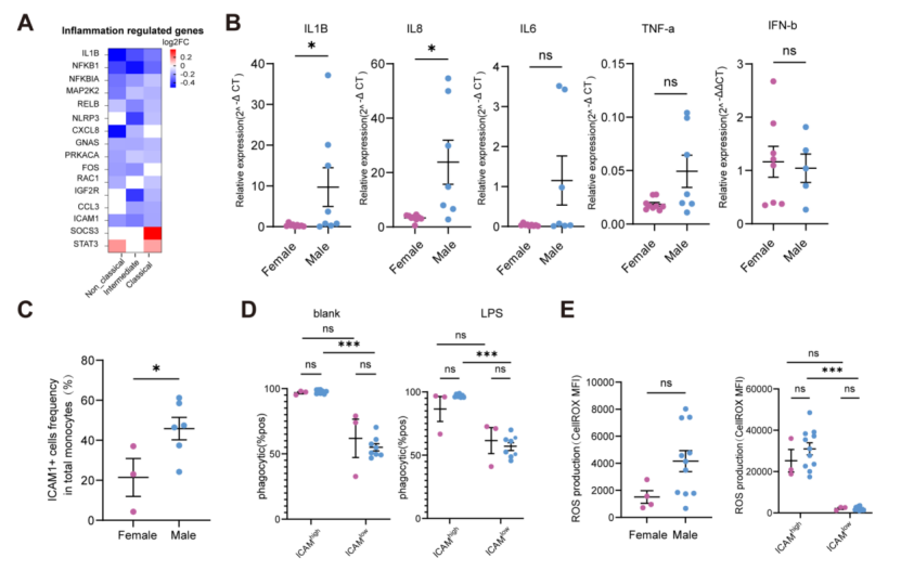 • 数量与表型: 男性的经典型单核细胞比例更高,且细胞表面ICAM-1(CD54) 的表达水平显著高于女性。