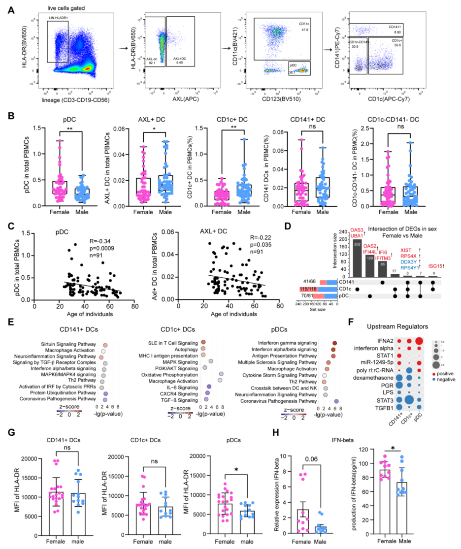 • 功能差异: 转录组分析显示,女性pDC的干扰素刺激基因(ISG) 基础表达水平更高。在用TLR7/8激动剂(R848)刺激后,女性pDC分泌的IFN-β(I型干扰素)产量明显高于男性。