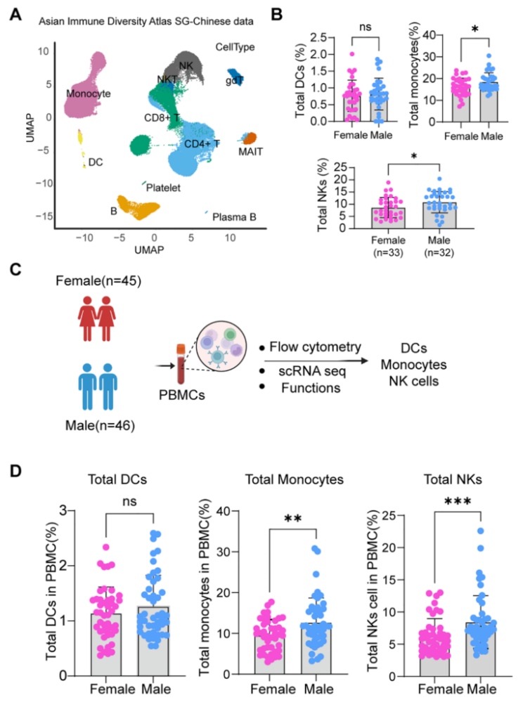 过去的研究往往停留在群体层面的比较,或者受限于西方人群样本。本篇研究首次基于91名健康中国汉族成年人的队列,结合高参数流式细胞术、单细胞转录组测序数据(scRNA-seq)以及功能性实验,系统性地绘制了亚洲人群先天免疫系统的性别二态性图谱。