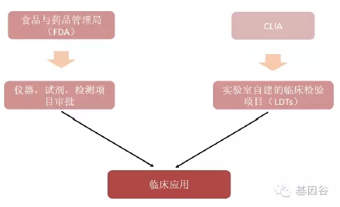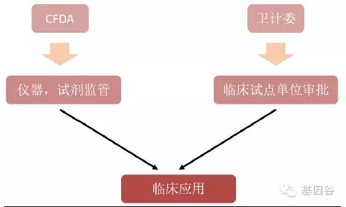国内的基于基因检测的液态活检项目进入临床也实行双重监管,所有仪器设备,试剂归CFDA 报批管理,临床实验归属卫计委管理。这与美国CLIA 认证制度类似。即要求试点单位内部有严格的质量控制,并且相关工作人员需经培训合格上岗,则不受CFDA 对仪器和试剂的注册限制。根据CFDA 在2014 年1 月公布的《食品药品监管总局办公厅关于基因分析仪等三个产品分类界定的通知》,基因测序诊断产品(包括基于测序仪及相关诊断试剂和软件),符合医疗器械的定义,应作为医疗器械管理,其中测序反应通用试剂盒(测序法)划为I 类医疗器械管理产品,基因测序仪作为III 类医疗器械管理。