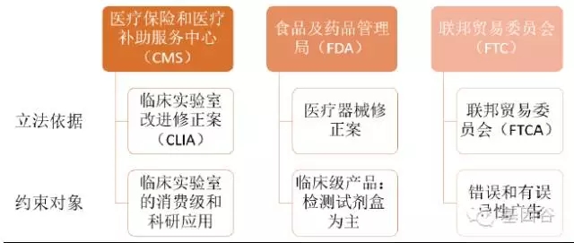 美国基因测序产业由医疗保险和医疗补助服务中心(CMS)、食品及药品管理局(FDA)和联邦贸易委员会(FTC)共同监管。CMS 主要通过《临床实验室改进法案修正案》(CLIA)监管消费级和科研级应用,FDA 负责临床级产品的审批,FTC 负责监管其中错误和有误导性的产品宣传。美国有近80%的实验室通过了CLIA 认证,意味着这些临床实验室试验结果的准确性、可靠性和时效性都将得到CLIA 认可,从而为其承接更多临床试验项目铺平道路,也意味着CLIA 实验室能够根据市场的现实需求,快速地开发实验室自建项目,并通过在临床上的应用给予可靠的临床指导。CLIA 认证解决了基础研究和临床应用之间低效率转化甚至脱节的问题,对转化医学和研究成果转化有非常重要的意义。美国大部分液态活检公司都是走CLIA 认证,而非FDA 认证。中国也借鉴了这种方式来规范国内基因检测公司的竞争。