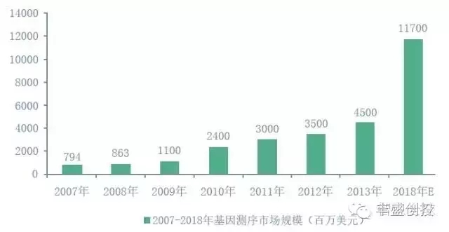 基因测序行业发展迅速,二代测序为主流技术。现下,一代基因测序技术由于通量较低、测序时间较长,已经不能满足研究应用的需要,以高通量低成本为特征的二代测序技术为目前应用最广泛的测序技术,测序时间相较于一代技术大大降低。基因测序作为精准医疗的重要一环,随着技术的进步以及成本的下降,近年来发展迅速,据BBCRESERCH统计,从2007年的7.94亿美元增长到2013年的45亿美元,复合增长率为33.5%,预计未来几年依旧会保持快速增长,2018年将达到117亿美元,复合增长率为21.1%。 2007-2018年全球基因测序市场规模图